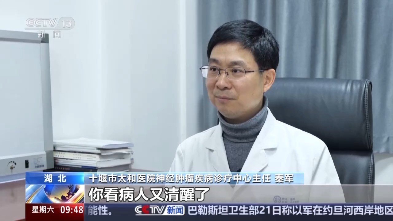 r 十堰市太和医院神经肿瘤疾病诊疗中心主任 秦军:肿瘤大小和生长的部位是罕见的,手术做了18个小时,经过一个多月的治疗,病人清醒,现在可以重新站起来走路。 r